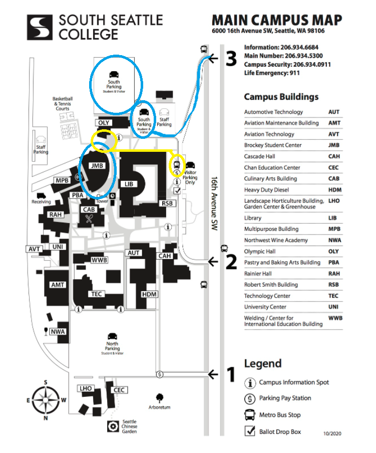 Turn right onto 16th Ave. S.W., follow north one mile to South Seattle College on right.